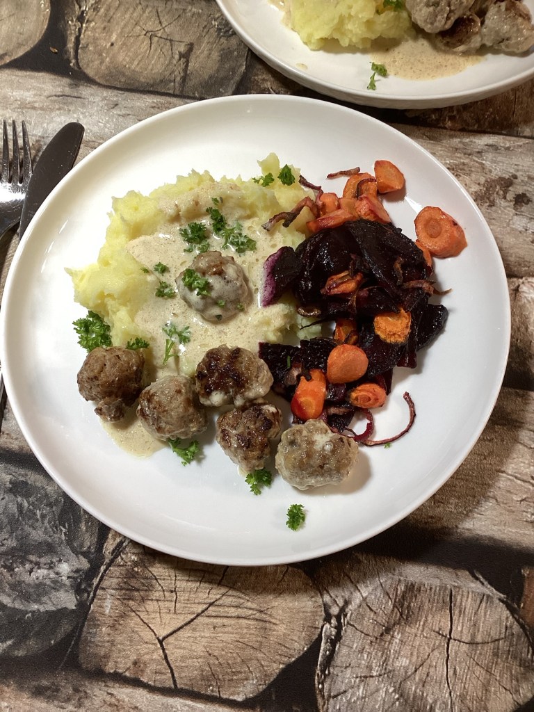 Das Ofengemüse kannst du je nach Saison variieren – zum Beispiel mit Süßkartoffeln, Kürbis oder Pastinaken. Auch ein Klecks Preiselbeeren passt hervorragend zu den Hackbällchen.