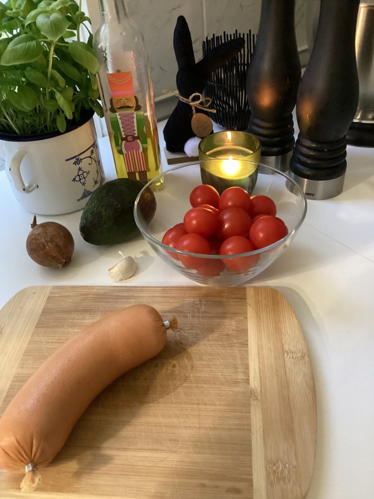 Zwiebel und Knoblauch fein hacken. Die Würstchen in mundgerechte Stücke schneiden. Kirschtomaten halbieren.
