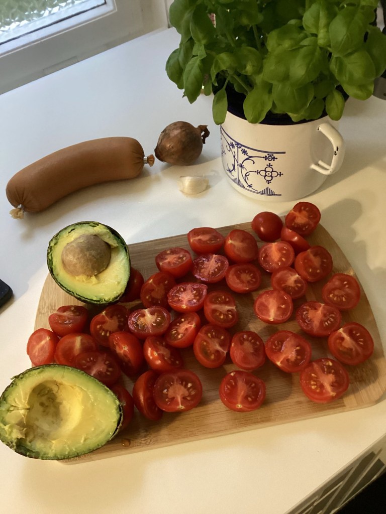 250 g Spaghetti (oder Pasta nach Wahl) 1 große Bratwurst oder mehrere kleine Würstchen 1 kleine Zwiebel 1 Knoblauchzehe 200 g Kirschtomaten 1/2 Avocado (optional für extra Cremigkeit) 2 EL Olivenöl 100 ml Sahne oder pflanzliche Alternative Salz & Pfeffer Paprikapulver (edelsüß) Frische Kräuter (z. B. Basilikum)
